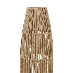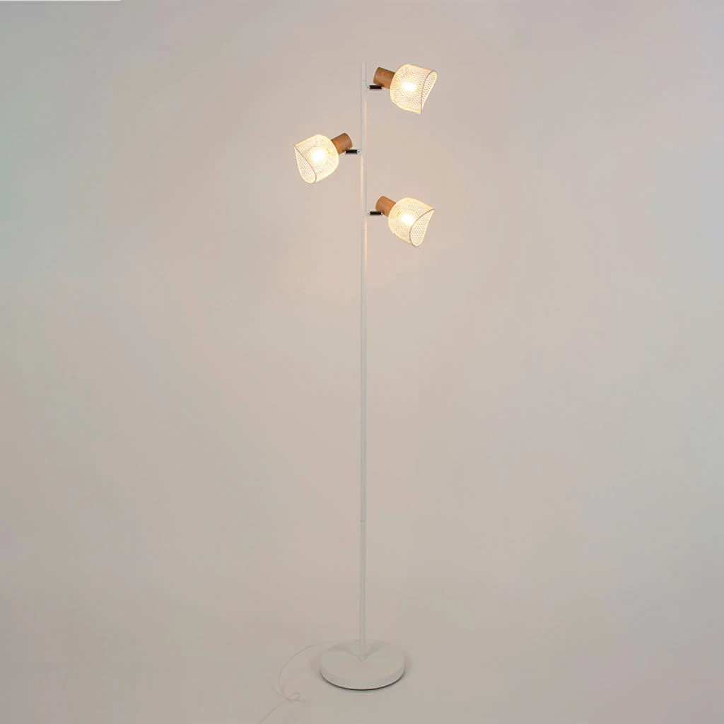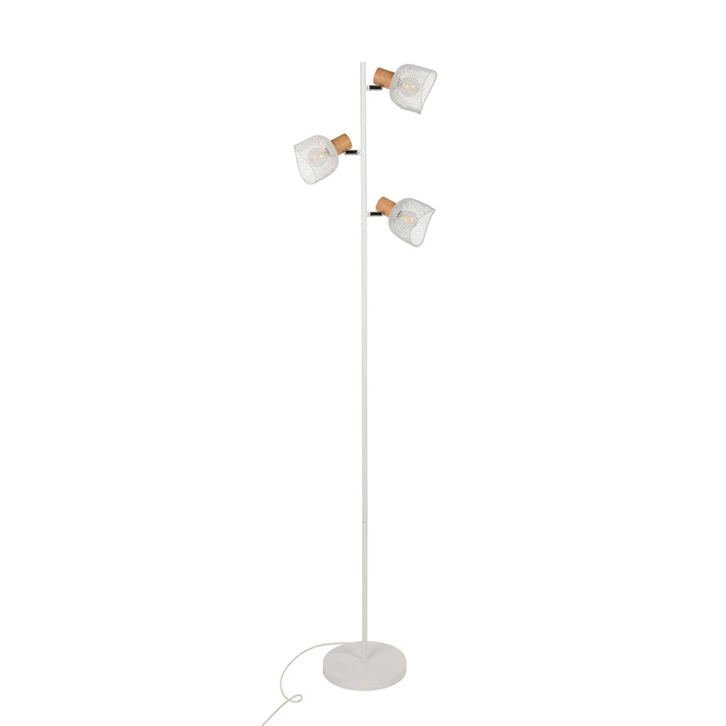Lampadaire base ronde en métal et finition effet bois. Abat-jour en métal grillagé peint. Coloris : blanc. IP20. D22cm – H153,50cm. Classe 2. E14-40W.