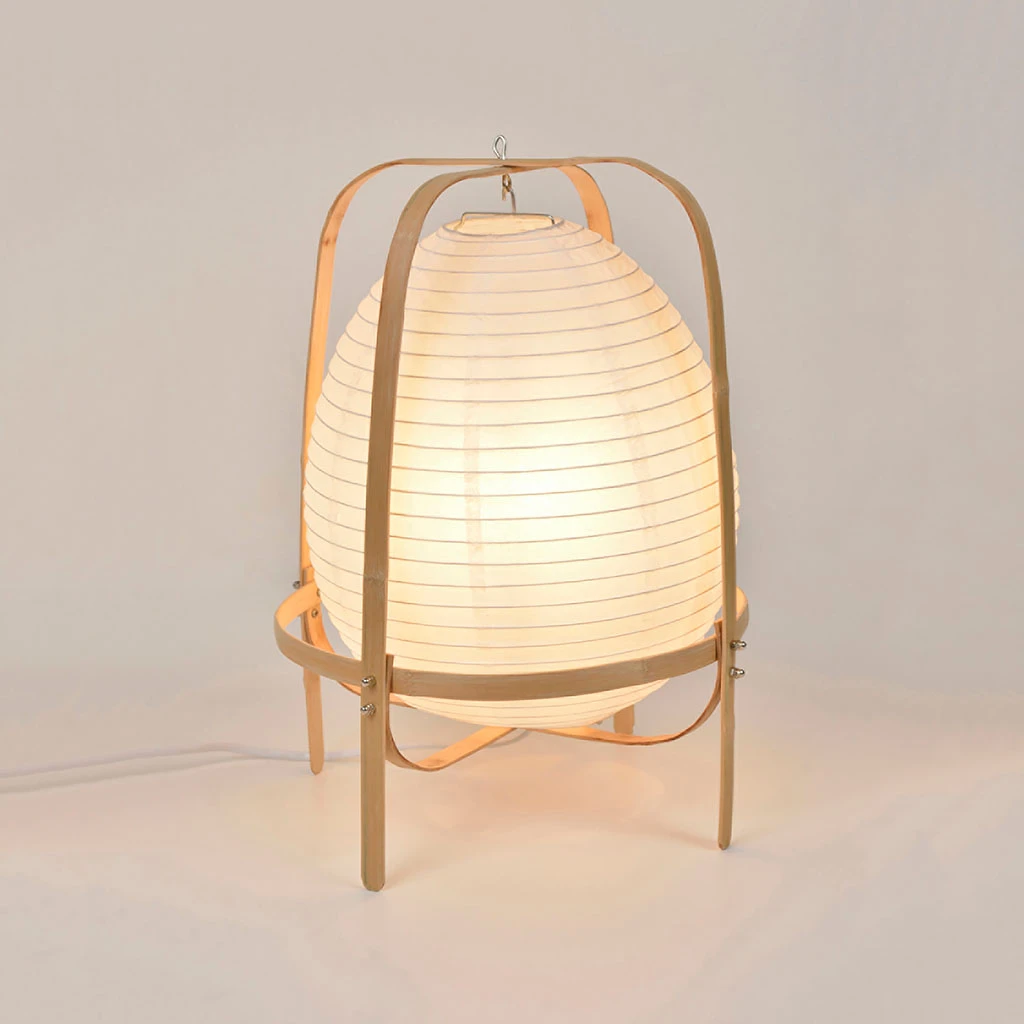 Lampe forme lanterne en papier japonais avec structure en bambou.