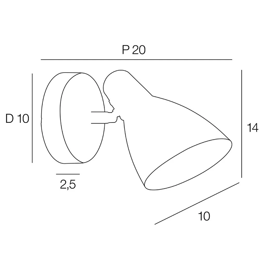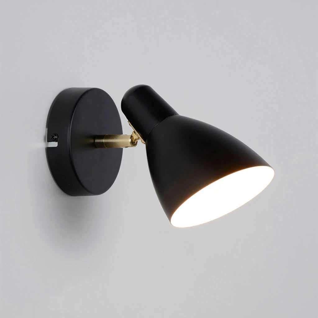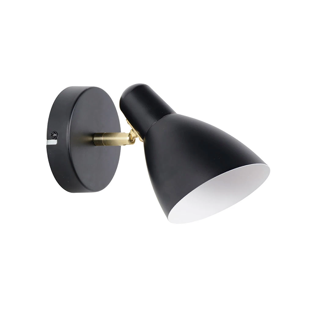 Spot 1 lumière style années 50. Base ronde en métal avec finition laiton et abat-jour orientable en métal peint. Tête orientable. Coloris : noir mat. IP20. H14cm-L20cm-P10cm. Classe 2. E14-15W.