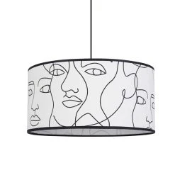 Suspension cylindre en coton imprimé, sur contrecollé transparent. Coloris : visages. IP20. D38cm – H19cm. Classe 2. E27-100W.