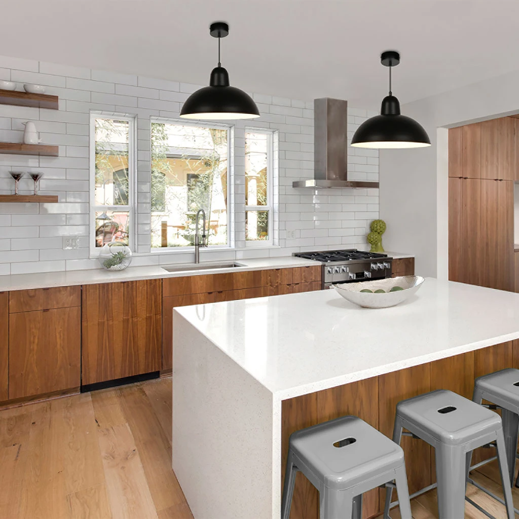 Suspension forme dôme, style années 50, en métal peint avec partie haute en métal. Équipée d’un pavillon adaptable DCL. Coloris : noir. IP20. D35cm – H20cm – HT105cm. Classe 2. E27-60W.