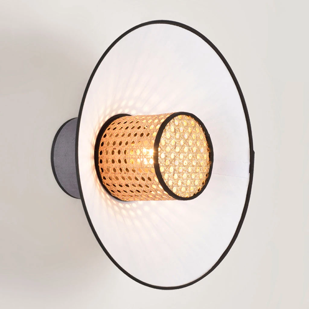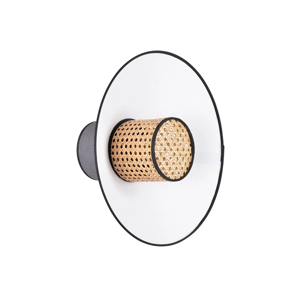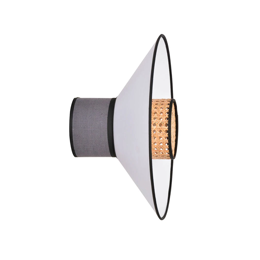 Applique forme conique empilement de 3 abat-jour en lin lavé et cannage, fabriqués en France. Équipée d’une base ronde en métal peint adaptable DCL.