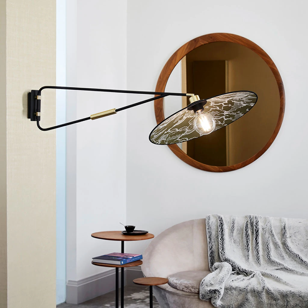 Applique déportée base rectangle. Bras pivotant, finition sablée détails laiton. Équipée d’un abat-jour conique bi-matière. Cache douille et douille orientable. Coloris : kumo kaki. IP20. D50cm – P103cm – H35cm. Classe 2. E27-40W.