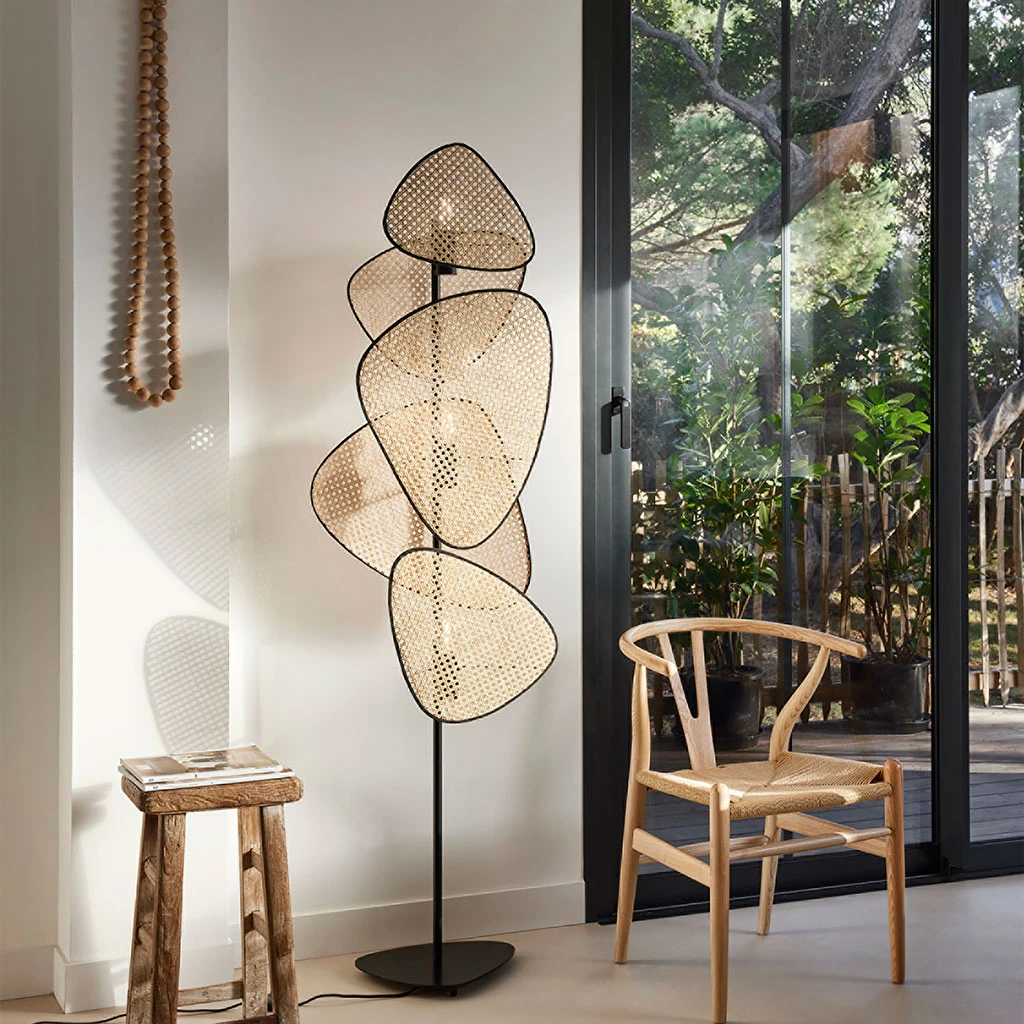 Lampadaire 3 lumières base en métal peint. Abat-jour composé de 5 écrans en cannage. 3 ampoules E27 40W max non fournies.