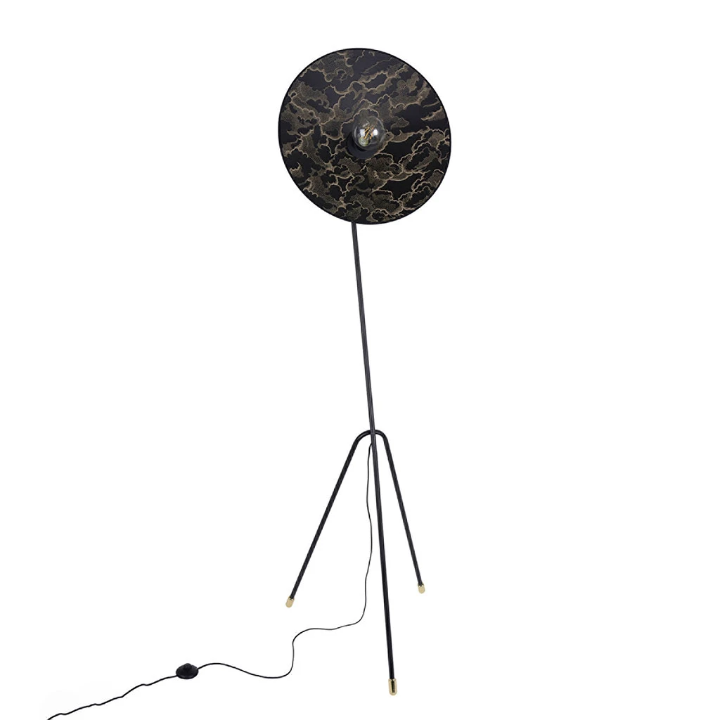 Lampadaire en métal peint finition sablée et détails laiton, forme trépied, orientable. Abat-jour conique bi-matière. Équipée d’un cordon textile et d’un interrupteur au pied. Coloris : kumo noir. IP20. L50cm – P59cm – H180cm. Classe 2. E27-60W.