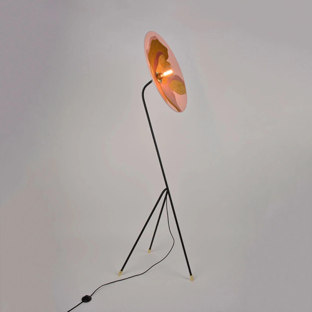 Lampadaire en métal peint finition sablée et détails laiton, forme trépied, orientable. Abat-jour conique bi-matière. Ampoule E27 15W max non fournie.
