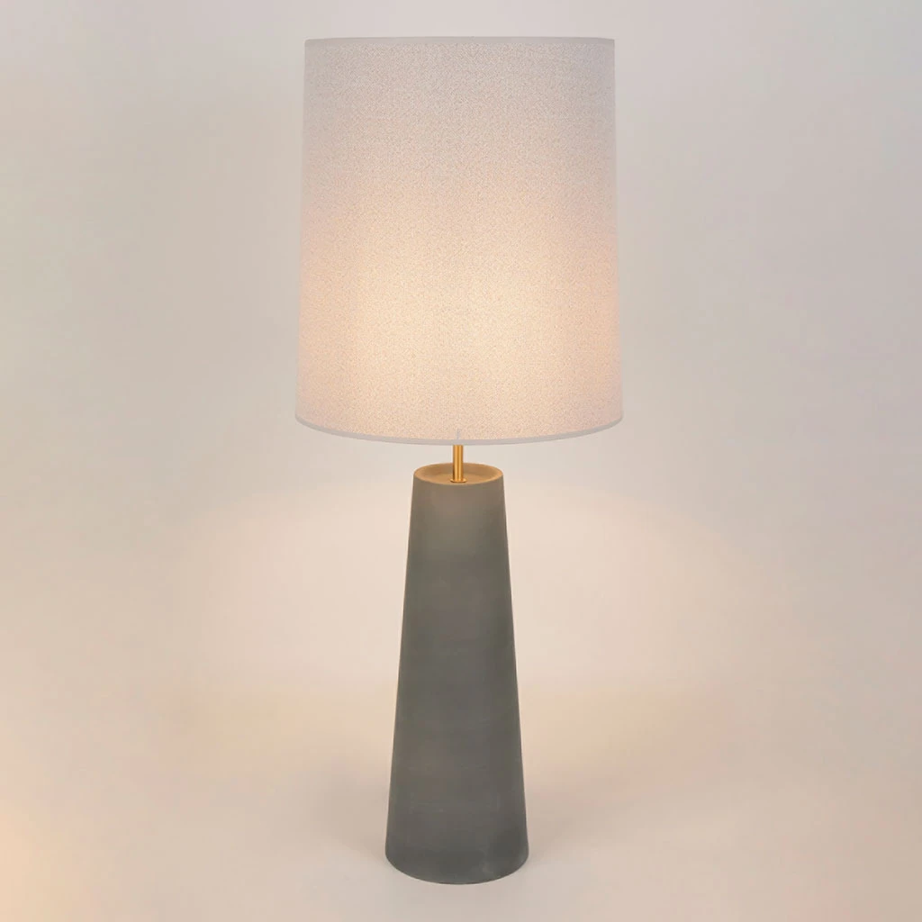 Lampe en céramique mat. Abat-jour conique en coton bouclette. Équipée d’un cordon textile. Coloris : grey. IP20. Lcm – D40cm – H101cm. Classe 2. E27-60W.