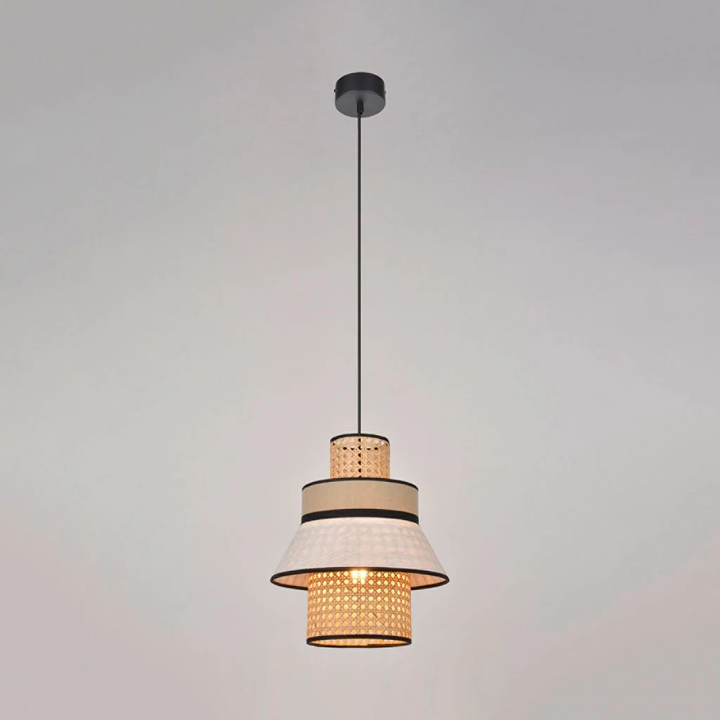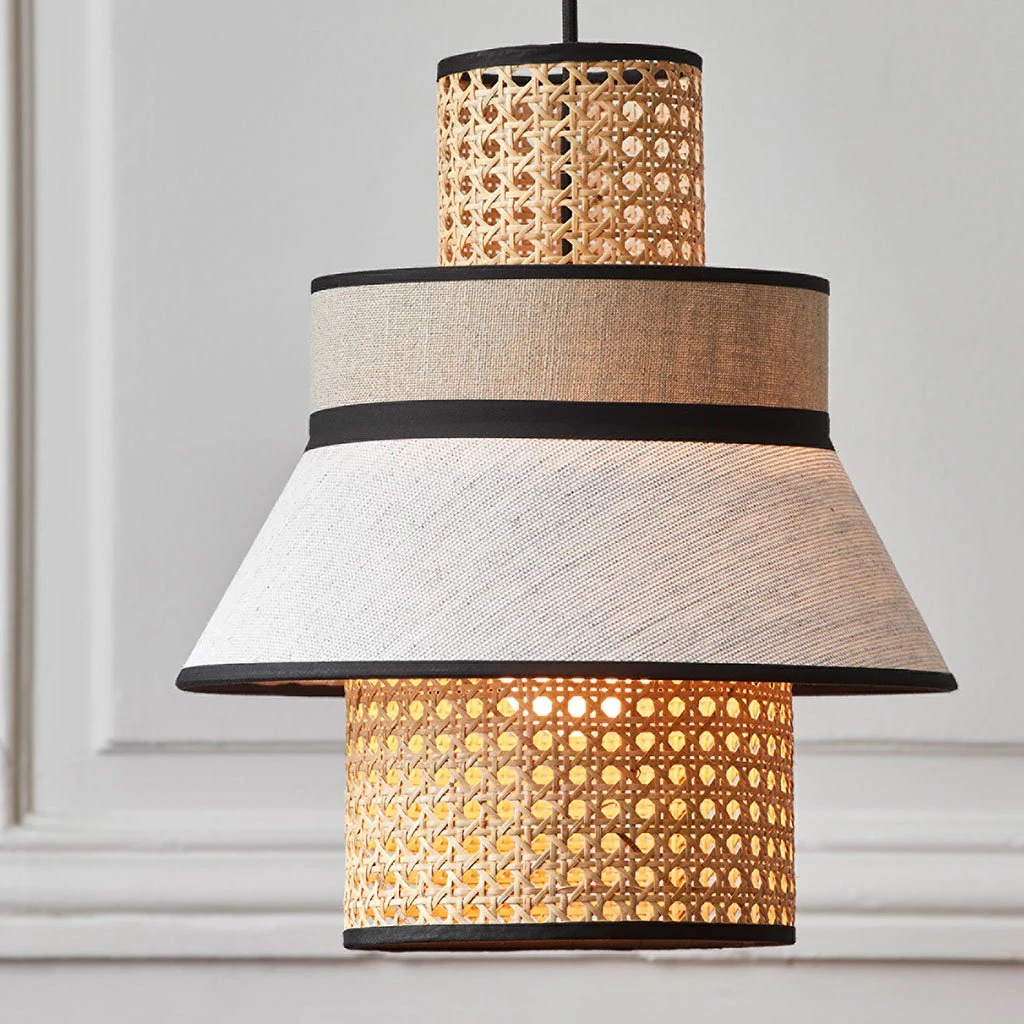 Suspension empilement de 4 abat-jour en lin lavé et cannage. Equipée d’un cordon textile et d’un pavillon en métal adaptable DCL. Ampoule E27 60W max non fournie.