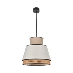 Suspension empilement de 3 abat-jour en lin lavé et cannage. Equipée d’un cordon textile et d’un pavillon en métal adaptable DCL. Ampoule E27 60W max non fournie.