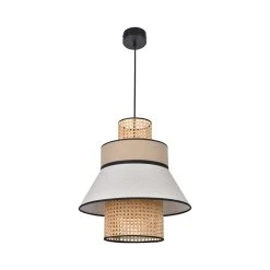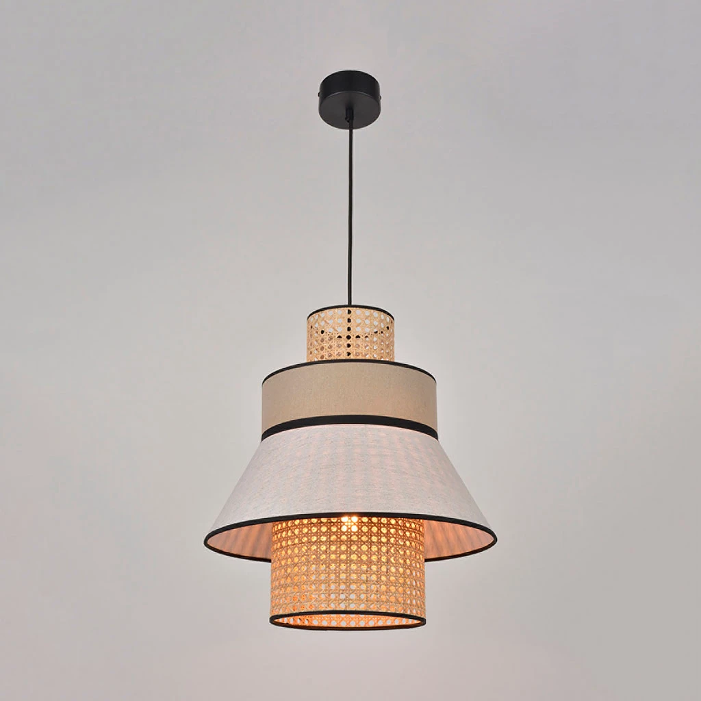 Suspension empilement de 4 abat-jour en lin lavé et cannage. Equipée d’un cordon textile et d’un pavillon en métal adaptable DCL. Ampoule E27 60W max non fournie.