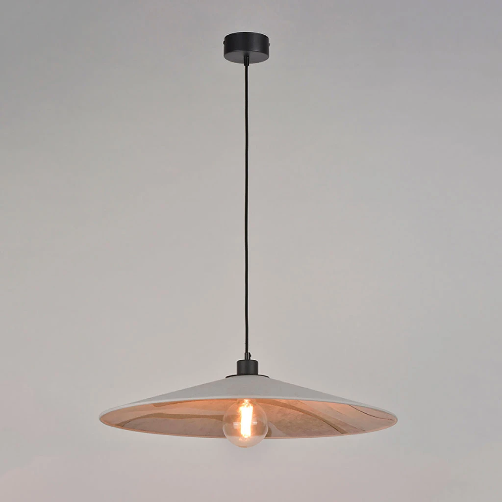 Suspension 1 lumière avec abat-jour conique bi-matière. Equipée d’un cordon textile et d’un pavillon en métal peint adaptable DCL. Ampoule E27 60W max non fournie.