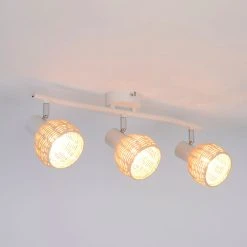 Suspension 8 lumières avec abat-jour cylindres en tissu bouclette. Équipée de cordons textiles et d’un pavillon en métal assorti. Coloris : blanc. IP20. D54cm – H168cm. Classe 2. E27-40W.
