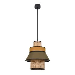 Suspension empilement de 4 abat-jour en lin lavé et cannage, fabriquée en France. Équipée d’un cordon textile et d’un pavillon en métal adaptable DCL.