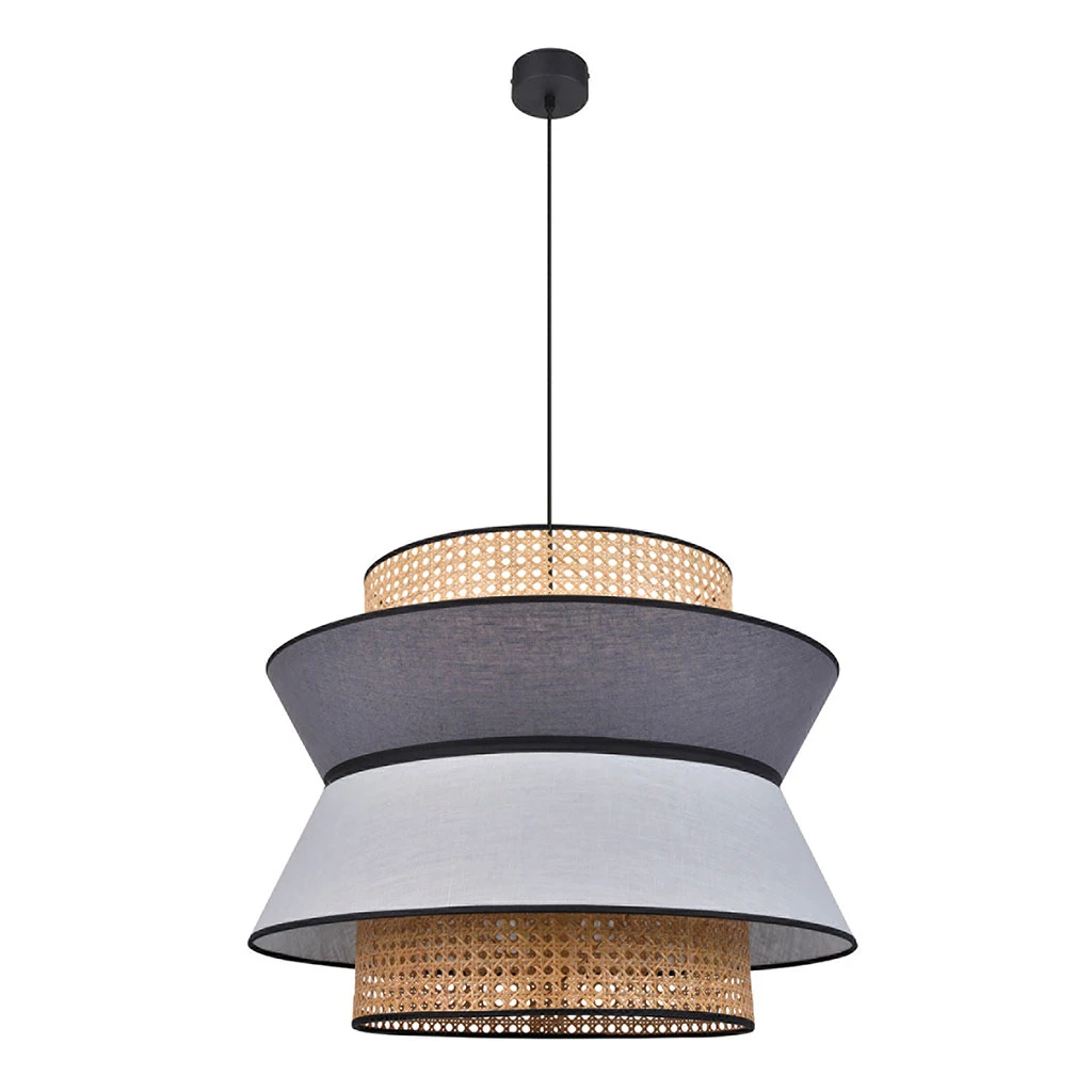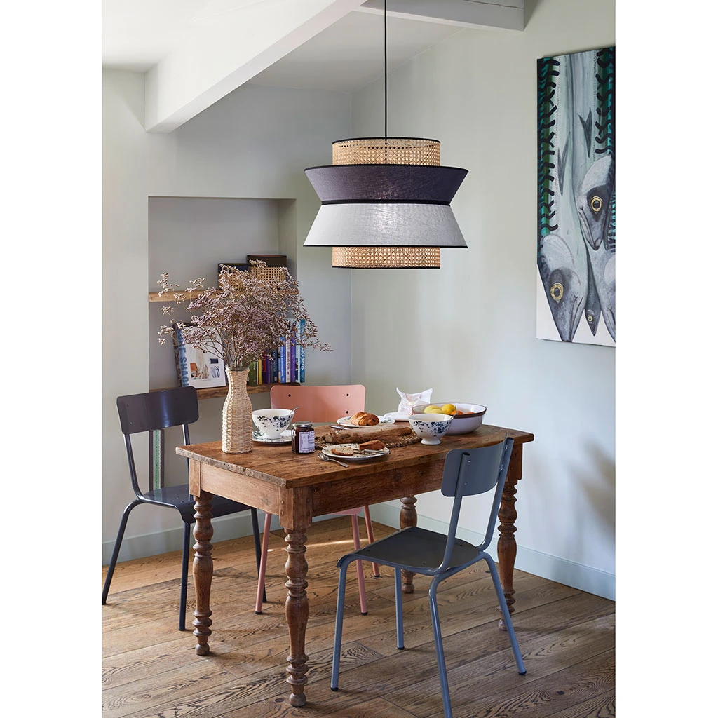 Suspension XL empilement de 3 abat-jour en lin lavé et cannage. Equipée d’un cordon textile et d’un pavillon en métal adaptable DCL.