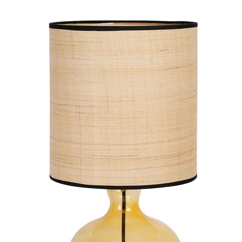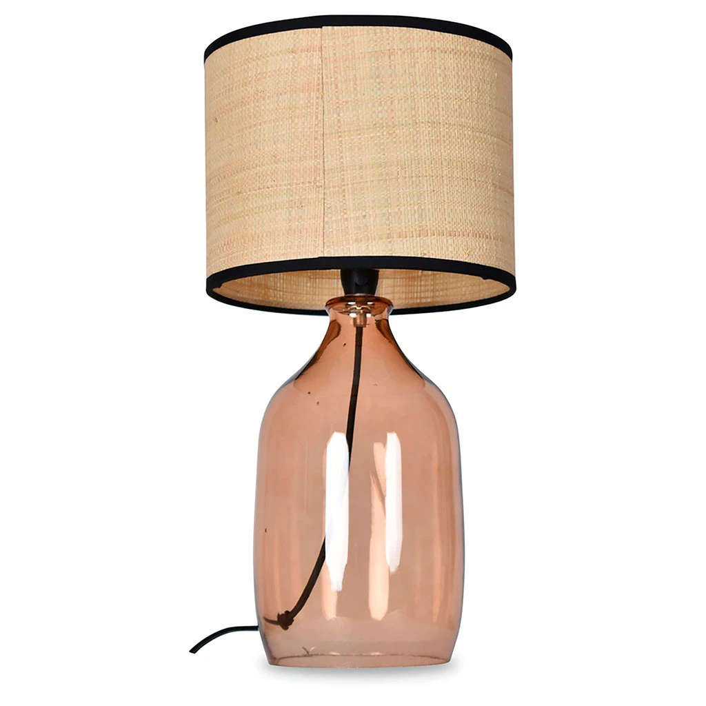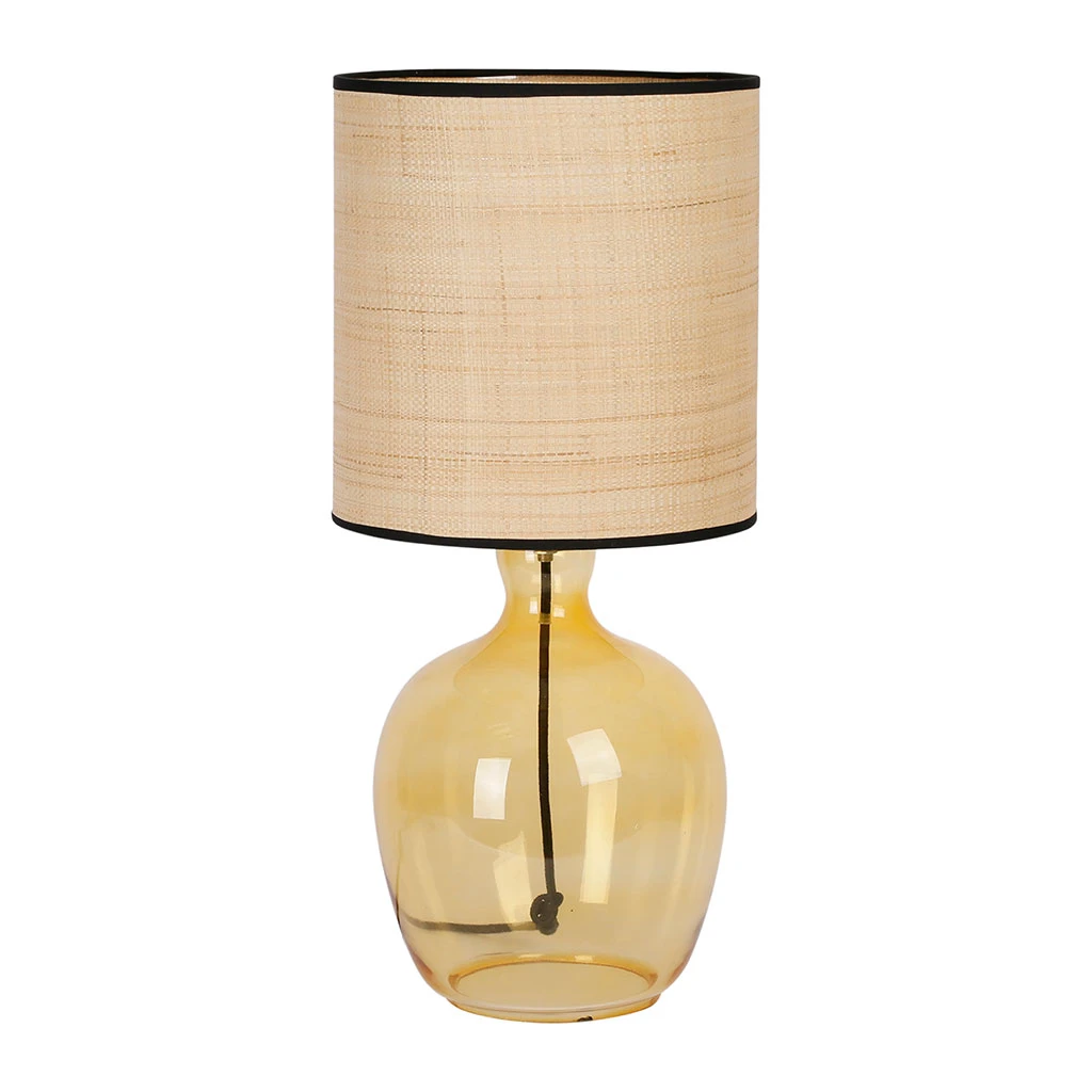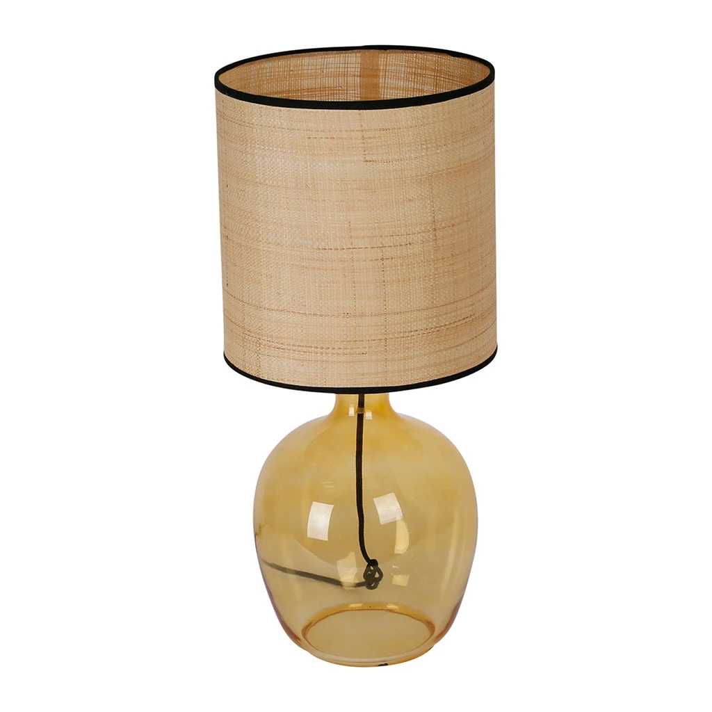 Lampe en verre ambré surmontée d’un abat-jour en raphia naturel (monté sur film plastique transparent à ne pas enlever) avec bord de couleur noire.